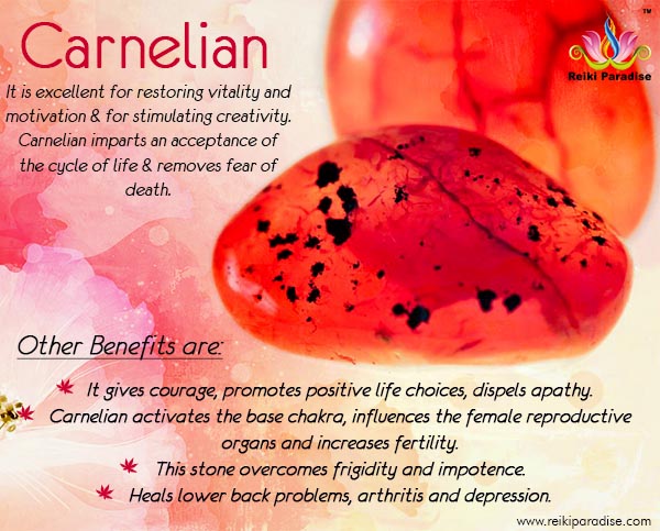 Carnelian is mainly used to heal lower body parts like in case lower back problems, knees and legs pains etc. But it is also very effective in case of arthritis, neuralgia, and depression, especially in those of advanced years. It regulates bodily fluids and the kidneys, accelerates healing in bones and ligaments, and stanches blood. Carnelian improves the absorption of vitamins and minerals and ensures a good supply of blood to organs and tissues.